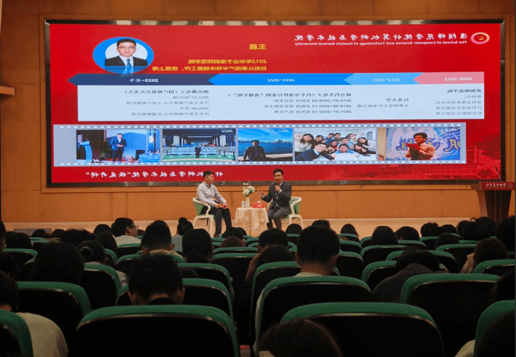 王晨以“风物长宜放眼量,穿越周期看成长”为主题,分享了自己跨界到汽车芯片销售领域从采购、销售主管到区域销售经理的四段职业经历,生动展现了计算机专业的多元发展潜力,为不想局限于单一专业发展方向的同学提供了新思路。随后,他结合自己从大学到工作的经历,和同学们分享了十句话,希望同学们能够做到珍惜时光、拓展人脉、善于规划、夯实基础、学会复盘、顺势而为。在访谈中,谈及多元化道路是否需要提前规划,他坦言,初期并无明确规划,而是在工作中逐渐摸清行业趋势,再基于判断调整方向。他建议同学们在校期间多交流、多实践,尝试不同领域,更易找到适合自己的方向。针对学生工作与学习如何平衡的提问,他表示,学生工作能够锻炼同学们的组织协调、资源整合与临场应变等能力,但关键是不能本末倒置,学习永远是第一位,需合理分配优先级,利用碎片化时间完成学习与工作的任务。