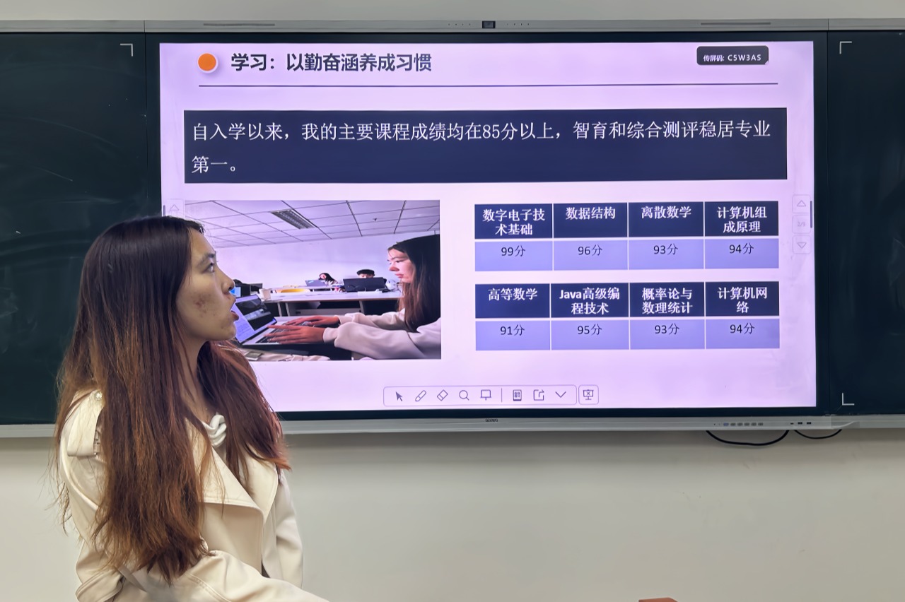 面向大一学生的专场宣讲由学生会执行主席高茹担任主讲。她以“志之所趋,无远弗届”开篇,回顾了自己从迷茫探索到“深耕专业”的转变历程,分享了“课上专注、课后勤思”的高效学习方法,强调通过构建知识体系、拓展阅读来筑牢专业基础。同时,她结合竞赛实践与社会经历,阐述了如何将理论知识转化为实践能力,并勉励学弟学妹“躬行不辍,则根基愈固”,为大一同学的专业学习指明了方向。